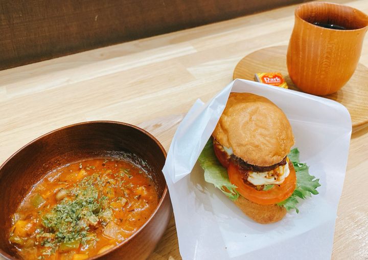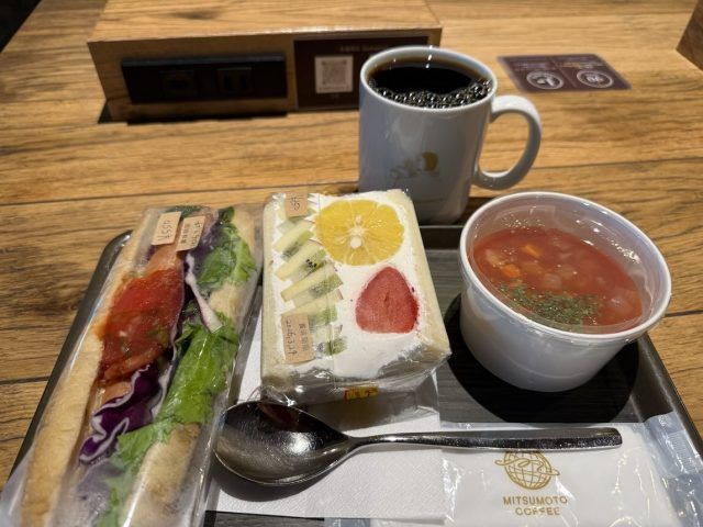 私はフルーツサンド、サンドイッチ、ミネストローネ、コーヒーをセレクト。