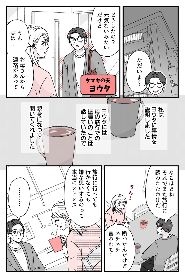 母からの電話でぐったりとしていた私は、帰宅したヨウタに話を聞いてもらいました。ヨウタにはもともと母の旅行での振舞いのことは話していたので、親身になって聞いてくれました。旅行に行きたくないとため息をつく私に、ヨウタは「僕たちのルールで旅行に行こう」と言ってきたのです。