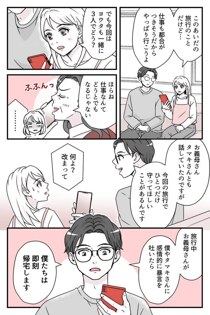 後日、ヨウタが一緒のときに母に電話をしました。旅行に行くことを伝えると母は「ほらね!」と勝ち誇ったように言ってきました。そこでヨウタが電話を代わり、冷静な口調で母に条件を出します。私はヨウタが口にする厳しいルールをハラハラしながら聞いていました。そんな私の様子を見て、ヨウタはにっこりします。