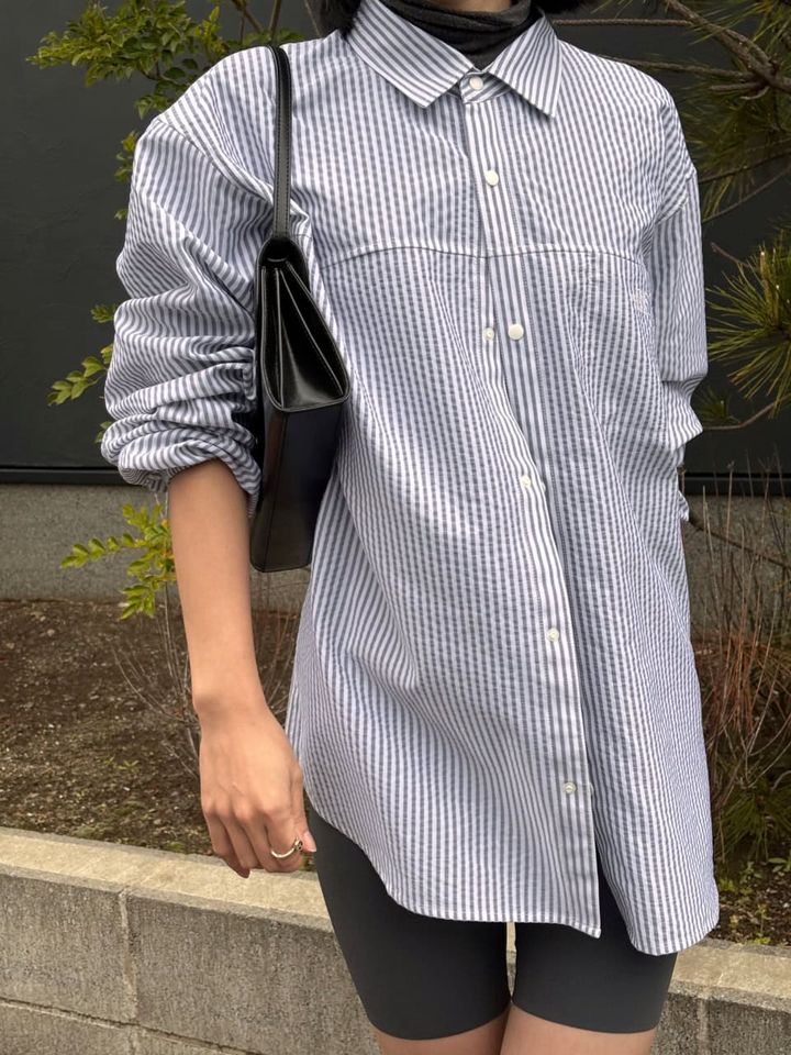 「ストライプシャツにランニングスパッツを合わせ、春の軽快なアクティブスタイル。ガシガシ歩く日をイメージしたスポーティさながら、シャツを羽織ることでシティライクに仕上げています」