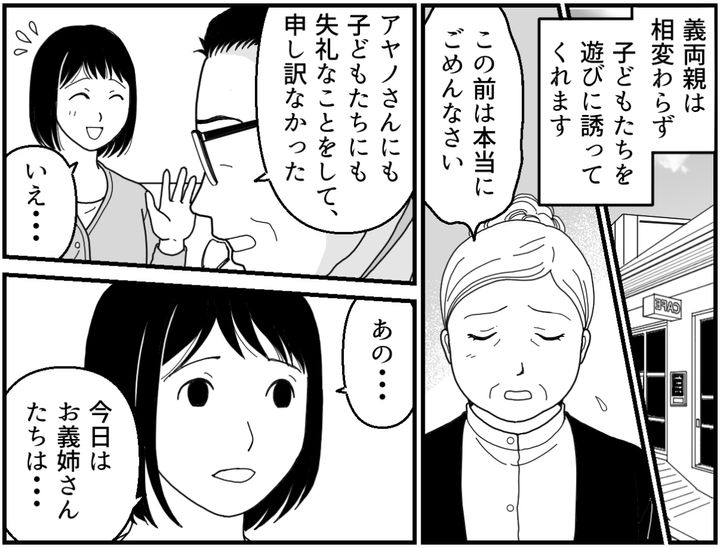 私(アヤノ)は、夫のヒロシと2人の子ども(コウ・4才、ミミ・2才)の4人家族。義両親とは定期的に交流を持っていました。しかし義姉キョウコさんが離婚をして、状況は一変。義両親と義姉は甥っ子の「父親」役として夫をあてにしてくるし、夫もまんざらでもない様子です。義姉の身勝手さは許すのに、なぜ私や子どもたちの我慢には無頓着でいられるのでしょう。限界を迎えた私は、義家族たちに怒りをぶつけました。その後、謝ってきた夫は……?