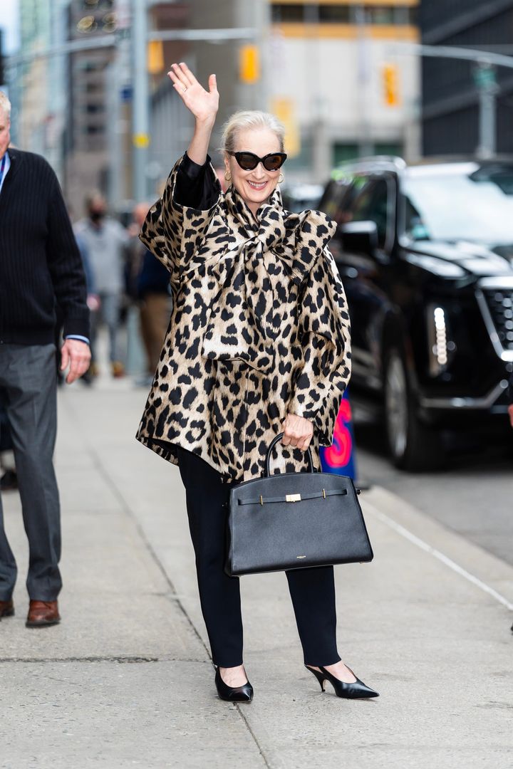 収録スタジオに到着した際のメリルは、シックなアニマルプリントのジャケットをまとい、自身が演じるミランダらしい佇まいを見事に体現。このジャケットは、アシスタントのデスクに無造作に放り投げられたとしても、この上なくファビュラスな存在感を放ちそうな一着だ。