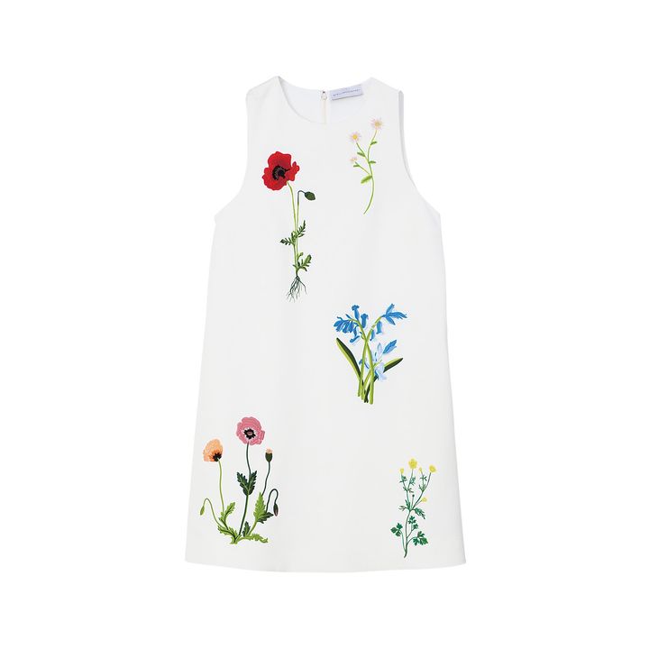 ポピーなどの野の花を、刺繍で白のワンピースに描写。フラワーアートをまとう感覚で着こなして。