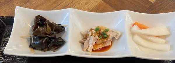 中華料理には欠かせない前菜は、大根の酢漬け、茹で豚、キクラゲの生姜和えの3品。どれも美味しく、ランチの時間から前菜まで食べられる幸せを噛み締めました。