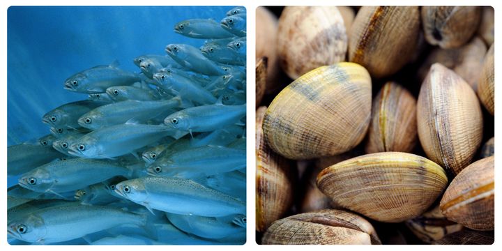 養殖水産物全般(魚、貝、エビなど)。