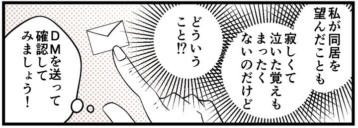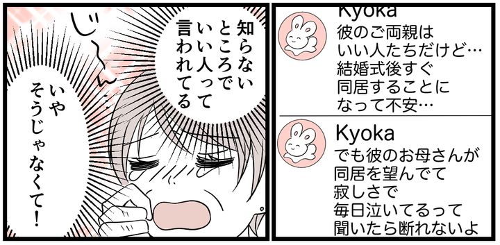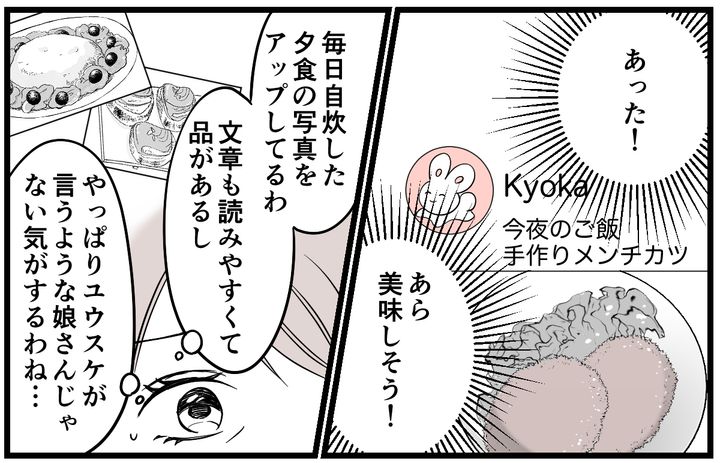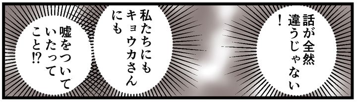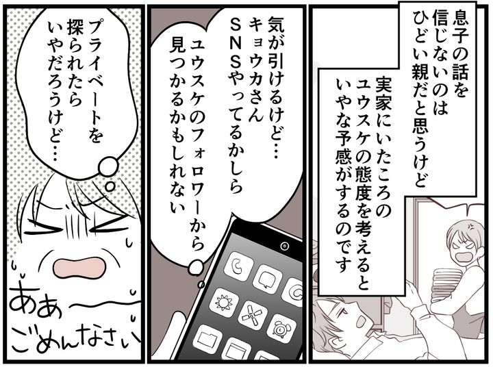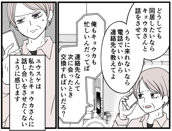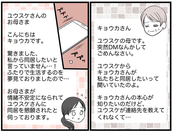 ユウスケが連絡先を教えないことに不信感を抱いた私。SNSでキョウカさんを特定してDMを送ることにしたのです。するとキョウカさんからは、驚愕の事実が……。なんとユウスケが、私には「キョウカがズボラだから同居で叩き直して」と嘘をつき、キョウカさんには「母が寂しくて泣いて同居を強いている」と真逆の嘘をついていたのです。