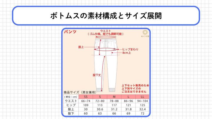 ボトムスの素材構成とサイズ展開(SS〜LL)