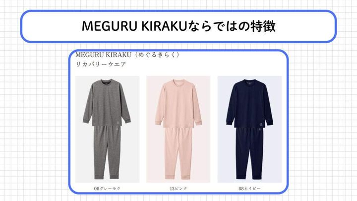 MEGURU KIRAKU(めぐるきらく)は、1876年創業の株式会社トンボが2025年9月2日に発売したリカバリーウェアです。