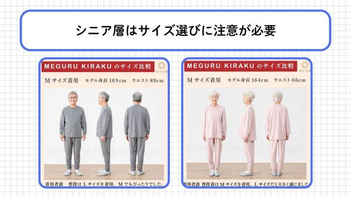 高齢者は筋肉量が落ちて体型が変わっていることがあるため、過去のサイズ感ではなく「今の体型」に合ったサイズを選ぶことが大切ですよ。