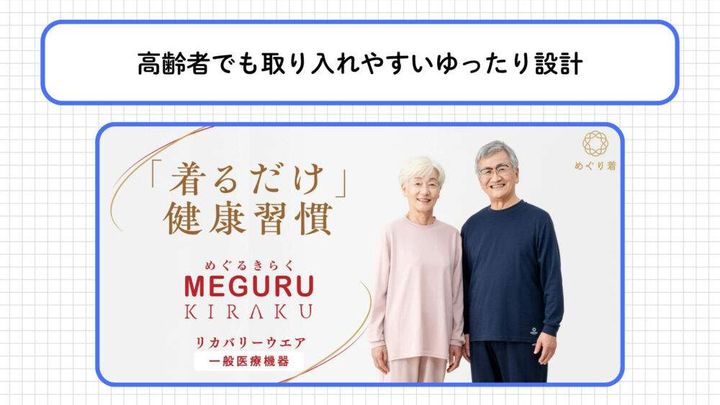 MEGURU KIRAKUは「睡眠時の着用」と「シニアの身体特性」を最優先に設計されている点で、スポーツ系リカバリーウェアとは根本的な思想が異なります。