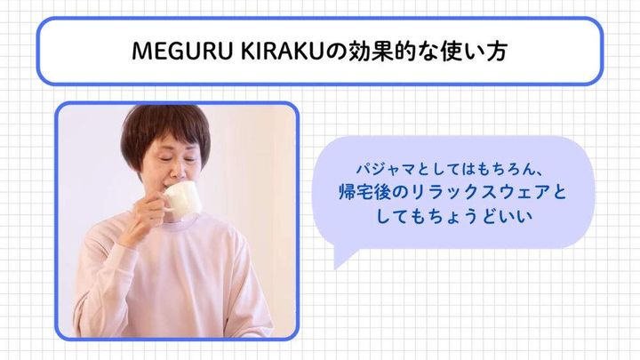 MEGURU KIRAKUは、日中のリラックスタイムや就寝時にも取り入れやすいリカバリーウェアです。