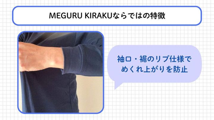 MEGURU KIRAKUでは手首と足首部分にフィット感のあるリブ(フライス)切り替えデザインを採用しています。