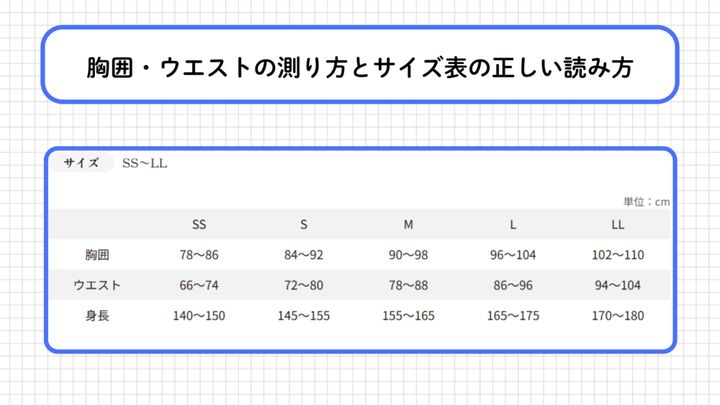 公式サイトに掲載されているサイズ表の「対応寸法」と自分の実寸を照らし合わせて、近いサイズを選ぶのが基本です。