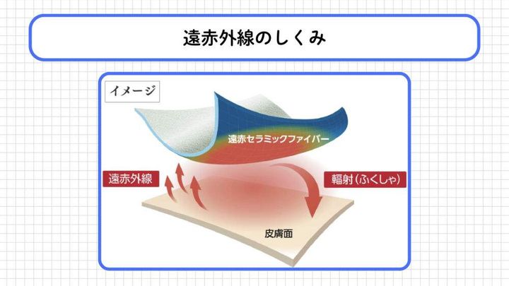 高濃度セラミック繊維が身体から発する遠赤外線エネルギーを吸収し、再び身体に輻射することで血行促進や疲労回復をサポートするのが基本的なしくみですよ。