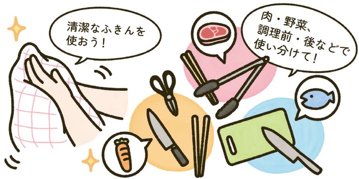 すでに徹底している人が多いと思いますが、作業に入る前はしっかり手を洗い、清潔なタオルやふきんで水分を拭き取ります。手に傷がある場合は手袋の着用が必須ですが、傷の有無にかかわらず食材を素手でさわるのは避け、菜箸やトングを活用しましょう。