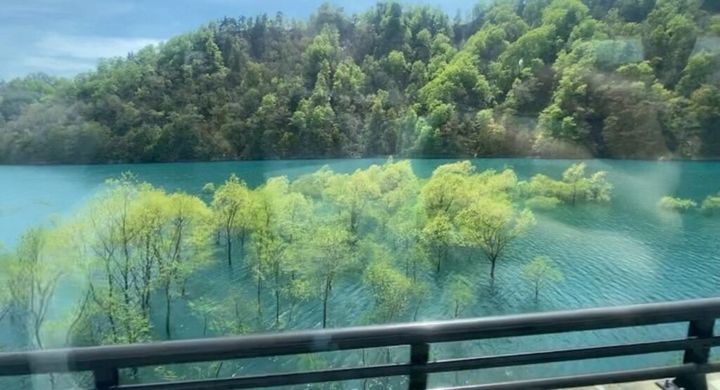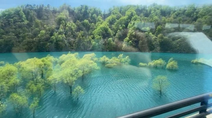 エメラルドグリーンの湖の中から、新緑の木々が伸びている。現実? 幻想? なんだこれは。わからない! でも、美しい。