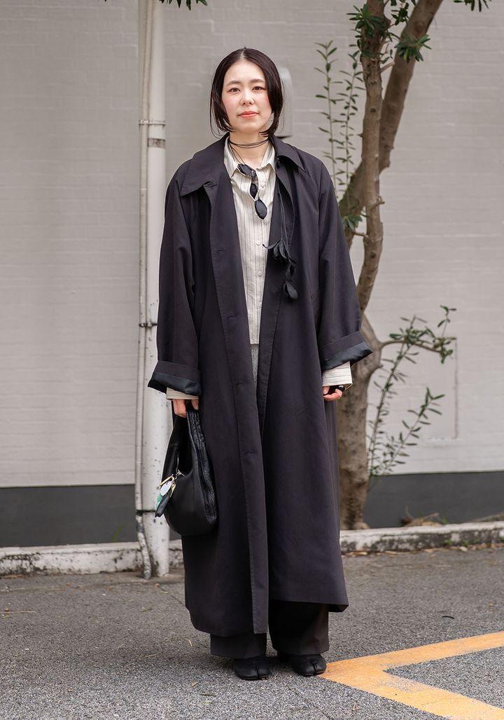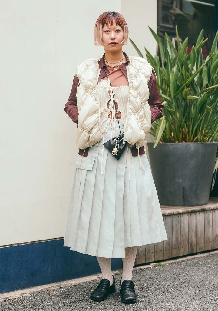 アウター/ミュラー、トップス/プリーツ・プリーズ・イッセイ・ミヤケ、インナー/アコーディオン、キャミソール/オープンセサミクラブ、スカート/サカイ、タイツ/アーバンアウトフィッターズ、バッグ/イッチ、シューズ/カチム