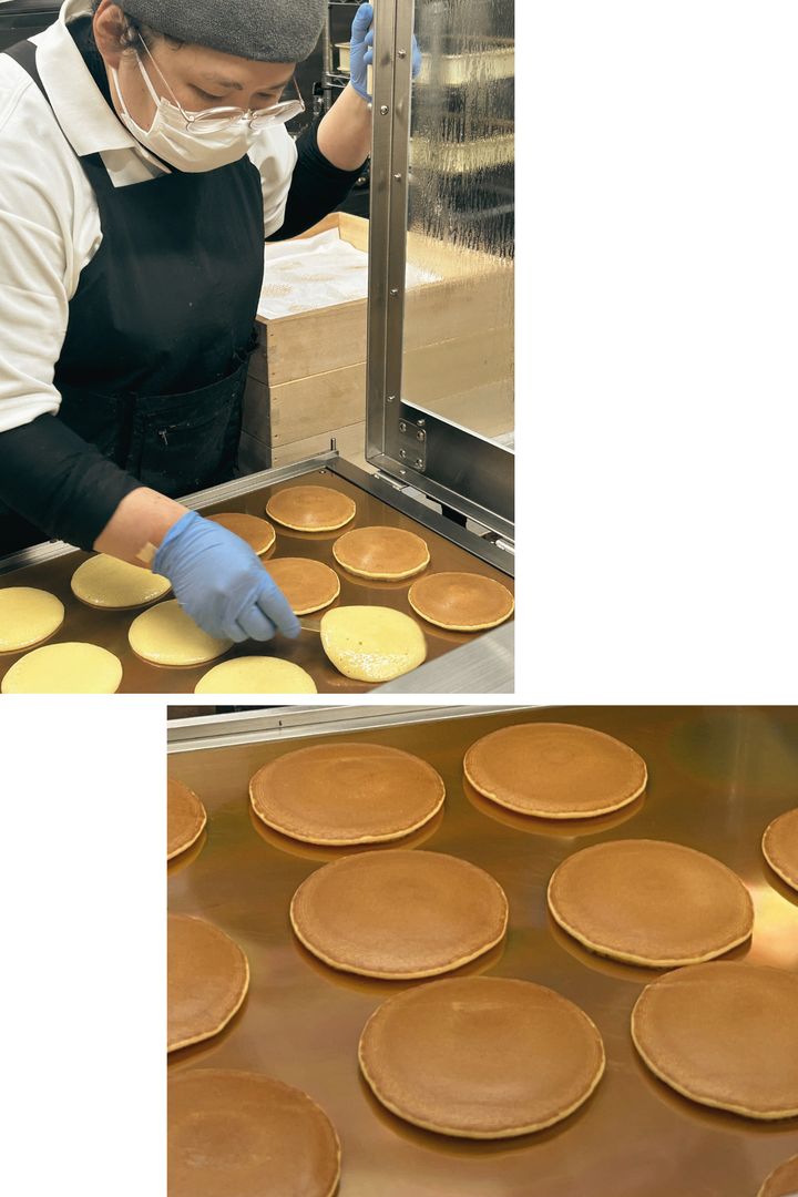 どら焼きの皮は、卵とはちみつ、砂糖を合わせ、小麦粉を加えて手ごねで仕上げる。空気を含ませながら丁寧に混ぜ合わせた生地を、専用の機械で一枚ずつ銅板に流し込み、蒸らしながら焼き上げることで、むちっとやわらかく、ほどよい弾力のある食感に。表面の香ばしさも際立つ。そこに粒あんをたっぷりと挟んで完成。皮からあんこまで、それぞれの素材の持ち味が引き立ち、見事な調和を生み出している。