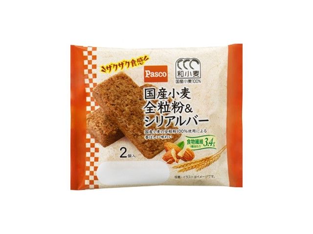 国産小麦の全粒粉100%使用による香ばしい味わい 香ばしい全粒粉のケーキ生地に、シリアル・アーモンド入りの全粒粉のクッキー生地を合わせ、焼き上げました。 日常生活で不足しがちな食物繊維を手軽に摂取できます(商品1個当たりの食物繊維量:3.4g)。2個入です。 日本の小麦100%です。 Pascoは「和小麦」を通じ、食料自給率の向上を目指して国産小麦商品を届けます。 カロリー:237kcal 【販売地域】東日本エリア/関西・中国エリア/中部エリア/四国エリア/九州エリア