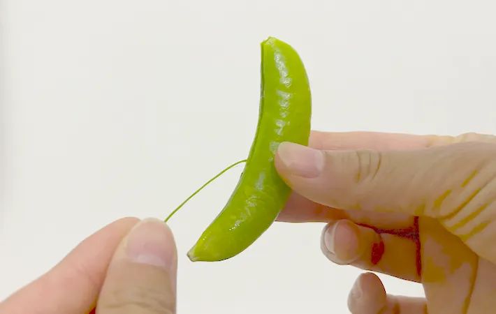スナップエンドウの筋を下に向かって引き、取り除きます。反対側の筋も忘れずに取りましょう。