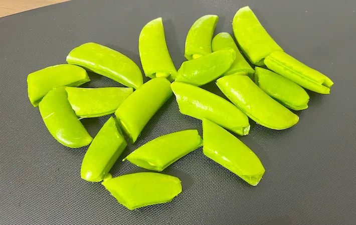 筋を取ったら、スナップエンドウを半分に切ってください。
