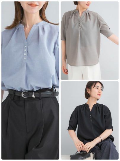 デコルテラインを美しく見せる開襟デザインのシャツ。まさにやりすぎない肌見せが叶う一着で、お仕事にもぴったりです。シワになりにくい素材を使っている点も高ポイント。ジャケットのインナーとしてもおすすめ。