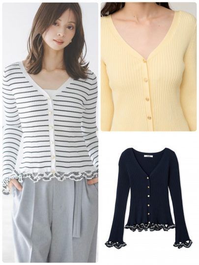 裾と袖口にあしらったフリルトリムがキュートなカーディガンが新着。広めに設定したVネックだから、顔まわりがすっきりとした印象に。インナー次第でデコルテの露出加減は調整できるところもポイントです。カーディガンとしてはもちろん、トップス感覚でも着こなせる1枚。