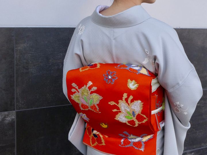 シーン②お初釜|金糸に縁取られた花々が舞う赤橙色の帯で彩りを