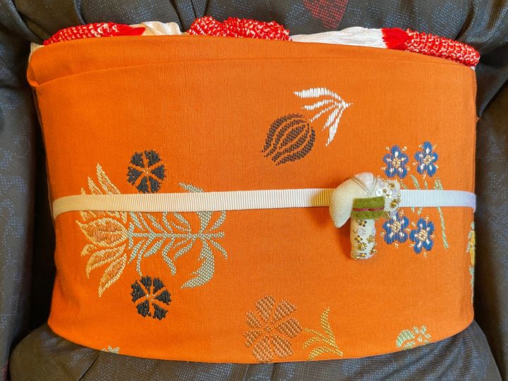 「こちらは着物好きの私のために、手芸を習っている友人からいただいたお誕生日プレゼントです。ハンドメイドアクセサリーブランド『monmannequin』の着物ブローチです。帯締めに通して着物コーデのポイントにしています」
