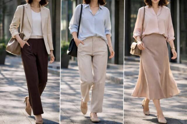黒や濃色に頼りすぎず、ベージュやライトグレーなどの中間色をベースに整えましょう。そこに一点だけコントラストを加えることで、軽やかさと引き締めのバランスが取れます。