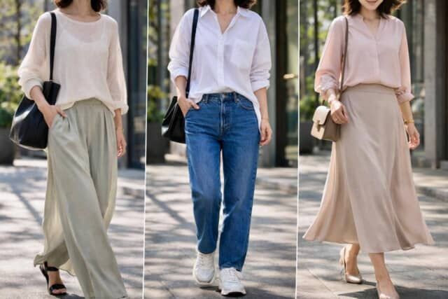 厚みのある素材を減らし、落ち感や揺れ感のある質感を選ぶのもポイントです。視覚的な軽さが加わることで、季節感とともに洗練された印象が生まれます。