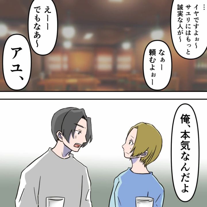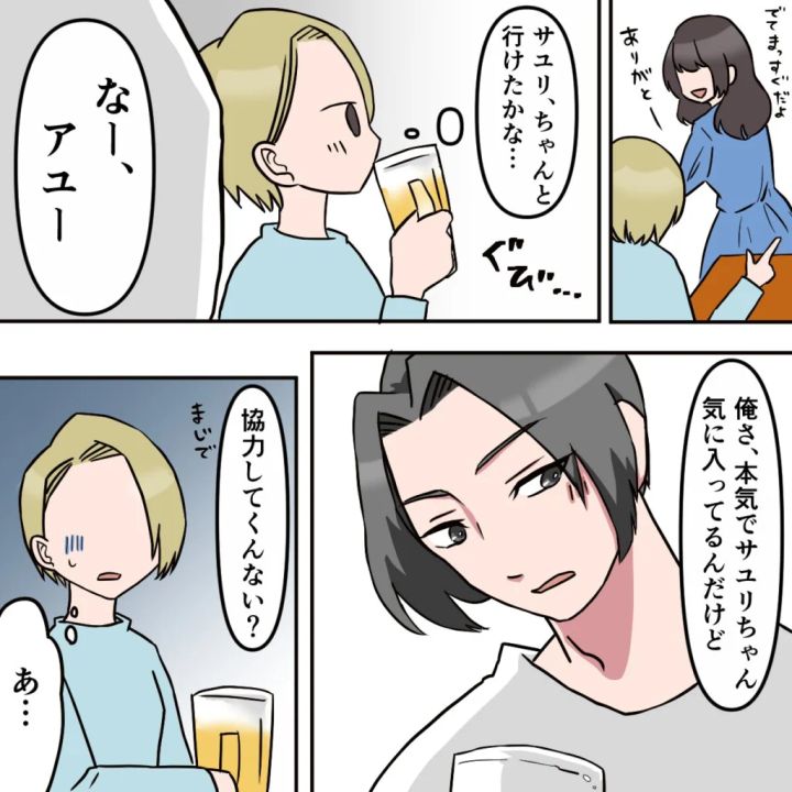 アユさんには、大学時代にサユリさんという親友がいました。男勝りなアユさんに対し、サユリさんは小柄で可愛くてまさに守ってあげたくなるような女の子。そのせいか男性からの人気も高く、デートのお誘いが絶えません。でも本人はまったく興味なし。いつもアユさんを最優先してデートの誘いを断っていました。そんなある日、サユリさんはとある講義をきっかけに、アユさんにタクマさんという好きな人がいることを知ってしまいます。アユさんの恋路を邪魔しないよう気を遣うサユリさんでしたが、それから1週間が経ったある日のこと、アユさんは恋人同士のような距離感で親しげに話すサユリさんとタクマさんの姿を目撃してしまいます。なんでも、初めて2人を紹介し合った日に偶然タクマさんが教室に戻ってきて連絡先を交換したのだとか。それでも、お互いを呼び捨てで呼び合うほど距離が縮まった2人に、アユさんは複雑な気持ちを抱いてしまいます。そんなアユさんに気づいたサユリさんは、タクマさんとの仲を否定。タクマさんに想いを寄せているアユさんに対し「応援する」と優しく微笑みました。