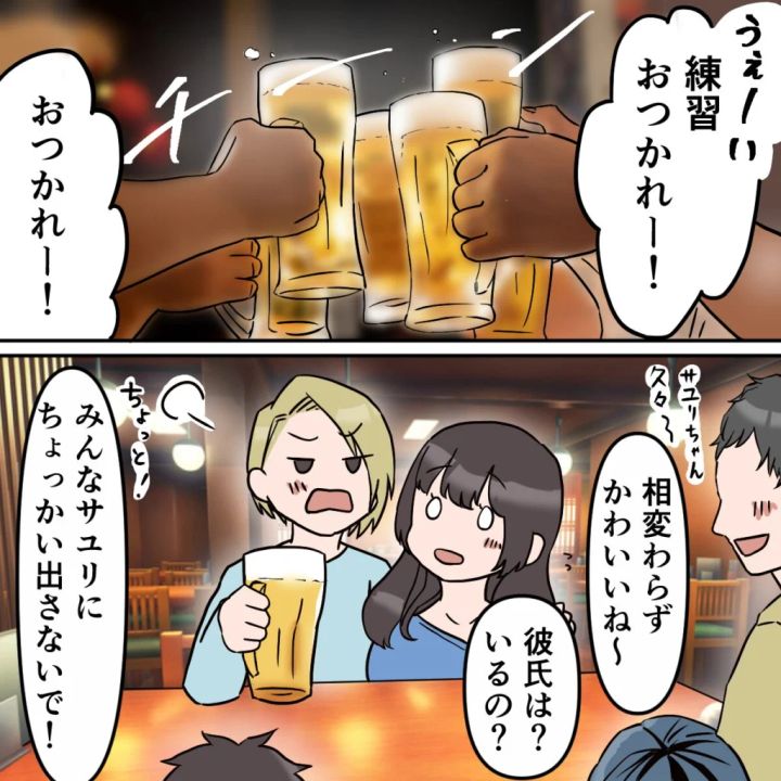練習終わり、サユリとサークルの仲間たちとご飯にやってきました。サークルの仲間たちはサユリを見るなり、「相変わらずかわいいね~」「彼氏は?いるの?」と鼻の下を伸ばして質問攻め。私はサユリをガードするように肩を抱くと、「ちょっと!みんなサユリにちょっかい出さないで!」と叱りました。