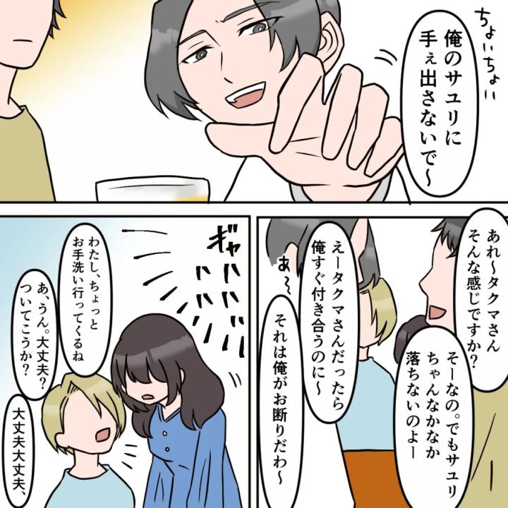 すると、少し離れた席に座っていたタクマさんが、「ちょいちょい、俺のサユリに手ぇ出さないで~」と冗談めかして声をかけてきました。後輩の1人が「あれ~タクマさんそんな感じですか?」と冷やかすと、タクマさんは「そーなの、でもサユリちゃんなかなか落ちないのよ」と困ったように笑います。面と向かって口説かれて気まずくなったのか、サユリは「ちょっとお手洗い行ってくるね」と言って席を立ちました。