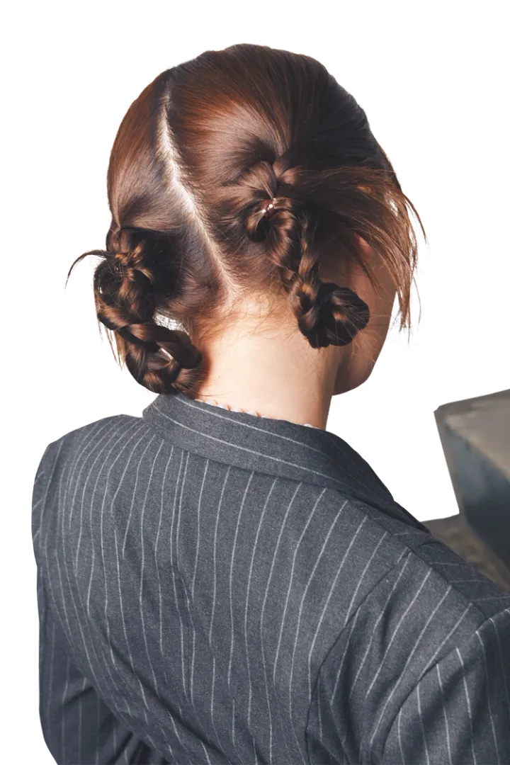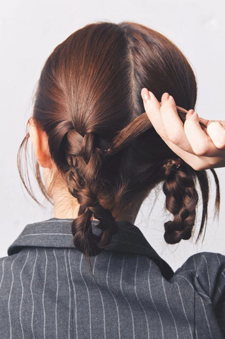 編み束は上に向かって折りたたむ。このとき、毛先を編み束の根元下にくぐらせて8の字のようなひねりを加える。毛先が耳横からピョンと出るように調整し、編み束の根元を細ゴムで結び固定。