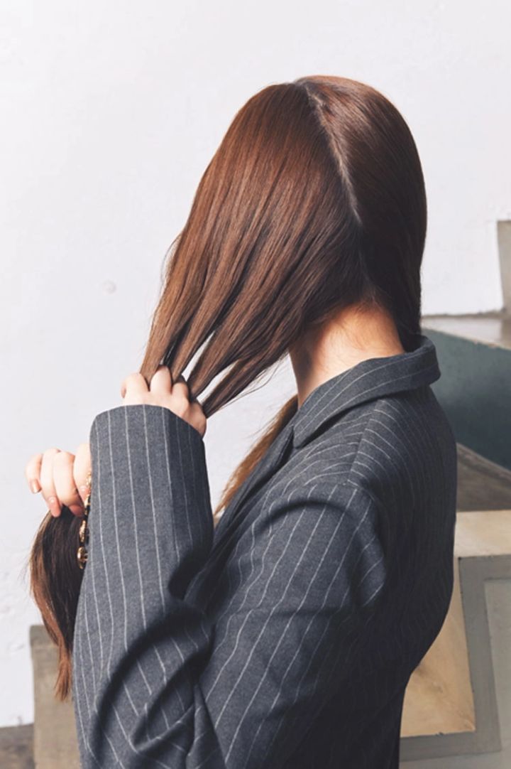指先にごく少量のバームをなじませ、残した毛先をスタイリング。毛先をさきながら細かい束感を作り、それが放射状に散らばるようにすると、シャープさが出てツインだんごの甘さをセーブできる。