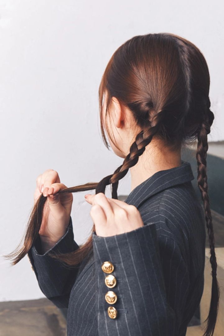1の毛束をそれぞれ、えり足より少し上の耳後ろの位置から三つ編みにする。このとき、三つ編みはできるだけタイトに編むのがポイント。毛先を7〜8㎝ほど残したところで、細ゴムを結ぶ。