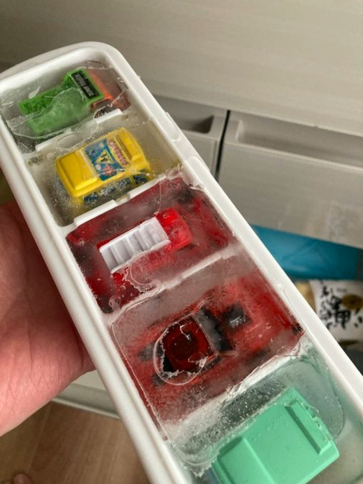 おもちゃの車を凍らせて、救出作戦としてお風呂に誘惑。バスボムにも中からおもちゃなどが飛び出すものがありますが、毎日使うとなるとちょっとお財布事情が気になります。その点、何度も使えてお子さんも自分で選べるのがいいアイデア!「今日はどれがいい?」と、親子のお風呂時間が楽しくなりそうですね。