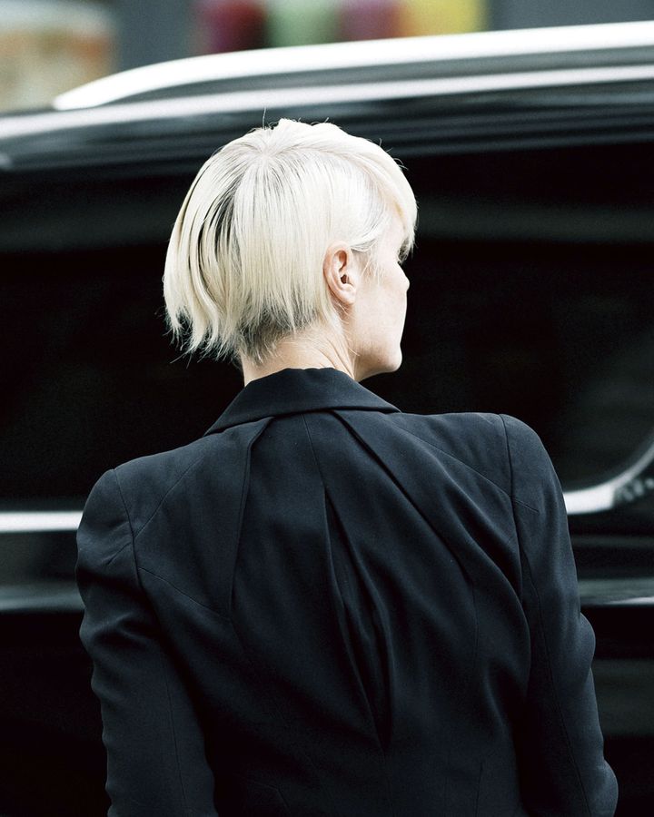 後頭部に丸みを出しつつ、毛先は軽さも演出。プラチナヘアとブラックのジャケットのコントラストも好相性。