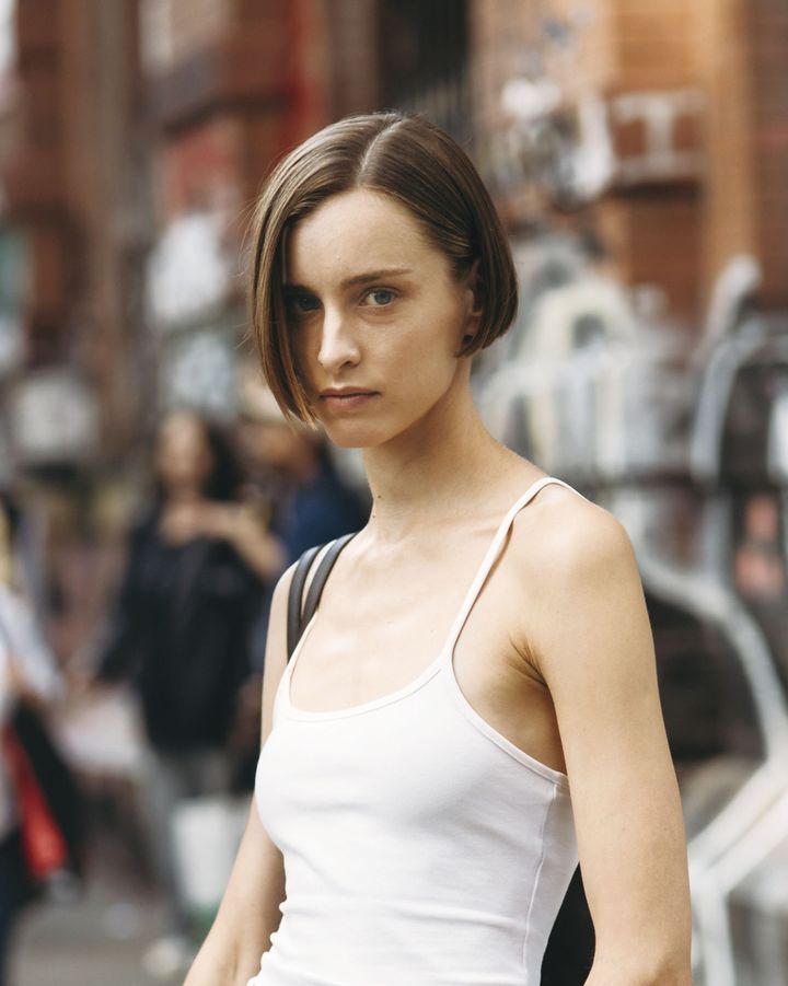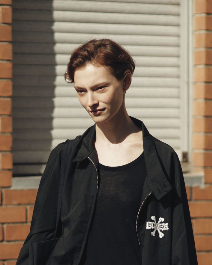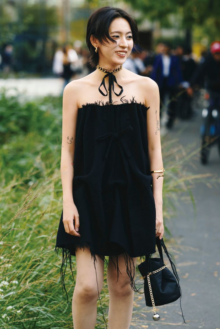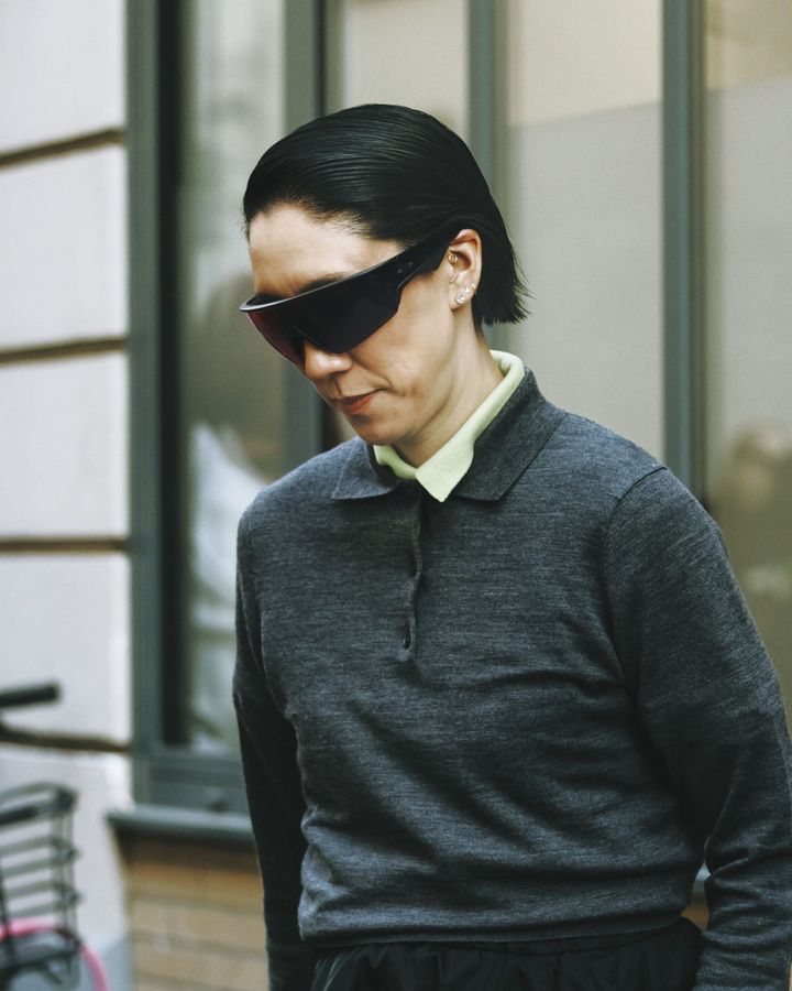 襟足よりも重めにつくった前髪は、ミニマルなファッションだからこそ、ヘア自体のフォルム美が際立つ。「後頭部のカットラインが高い位置にあるため、襟足と首の美しさが強調されています」(KEIKOさん)