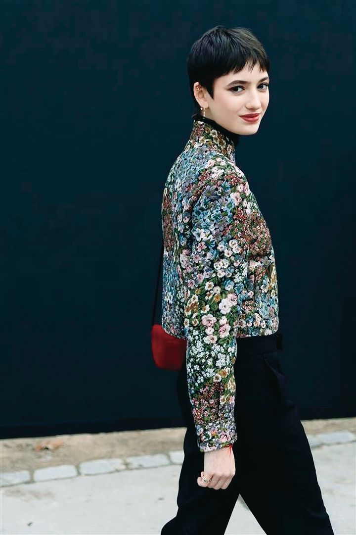 インパクトのある花柄ブルゾンだからこそ、ミニマルなピクシーカットが引き立つ。