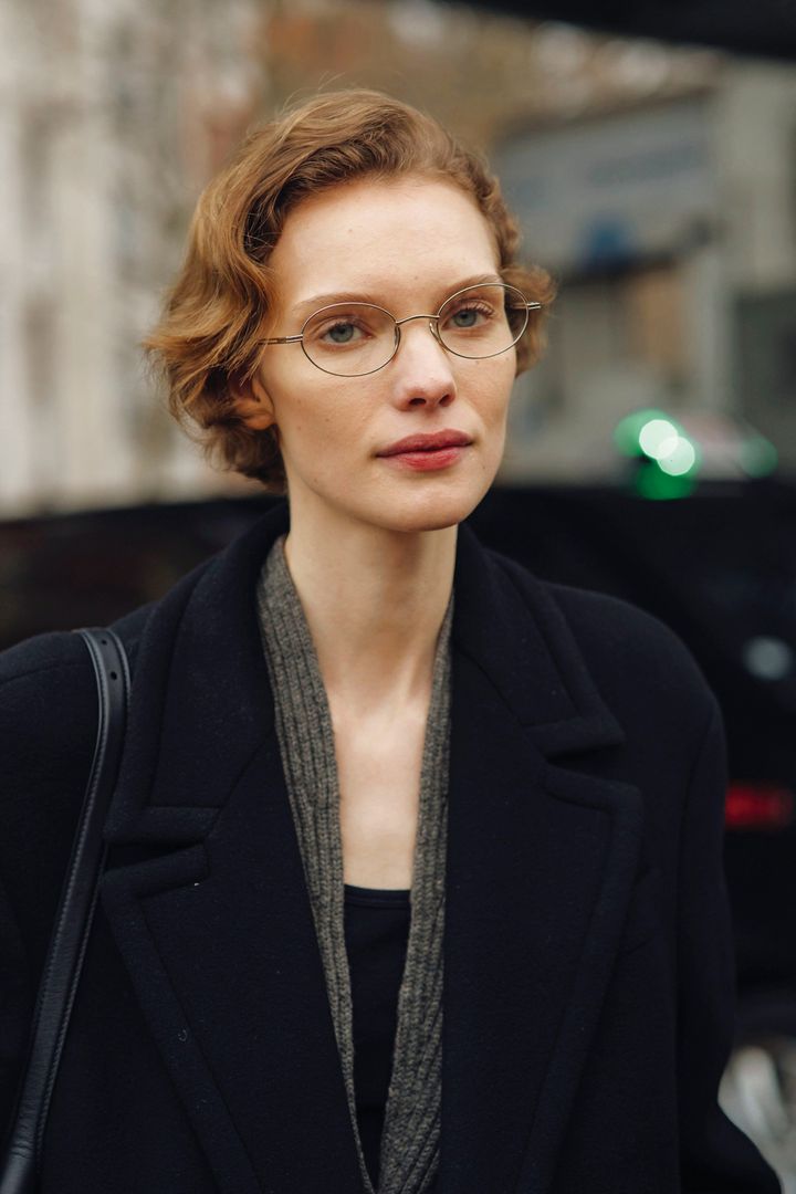 七三の分け目にかき上げたパーマとメガネの組み合わせで、女性らしさとインテリなムードが共存。