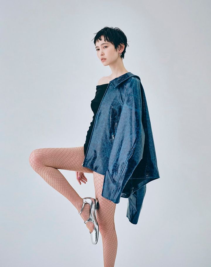 ジャケット¥88,000(ロエフ/エイチビューティー&ユース)、ボディスーツ¥48,400(イサボールダー/バウ インク)、ピアス¥52,700(トムウッド/トムウッド 青山店)、靴¥185,900(ピエール アルディ/ピエール アルディ 東京)、タイツはスタイリスト私物
