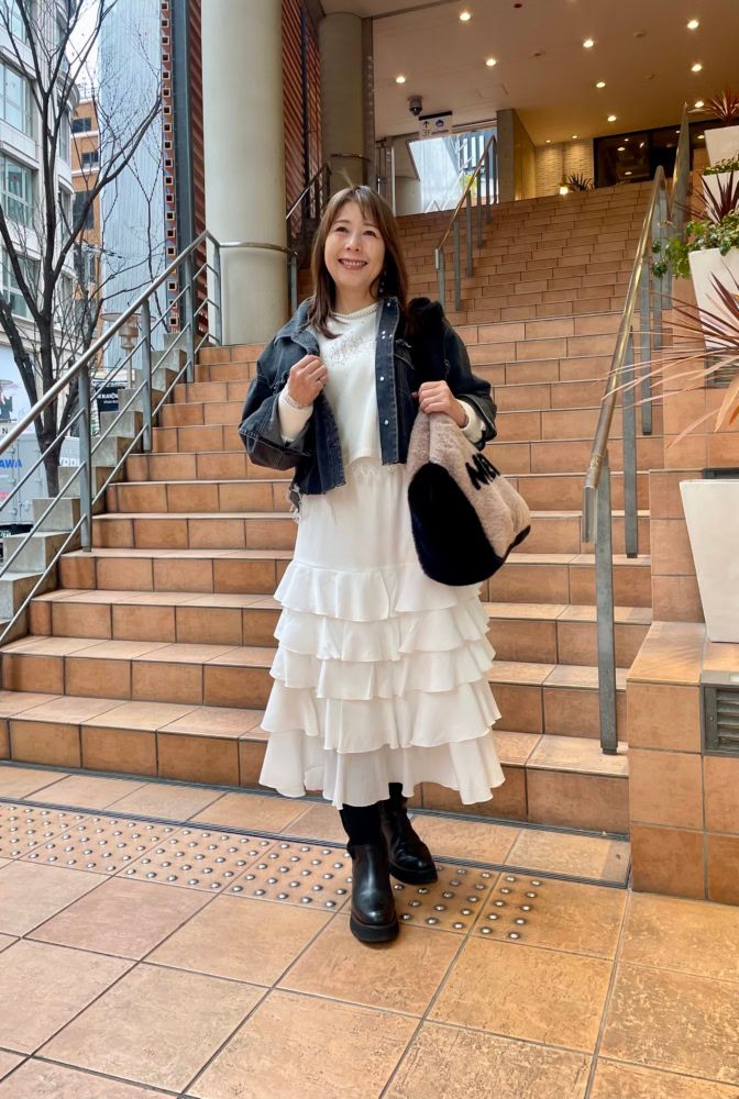 「フリルがたっぷりあるスカートも、デニムに合わせればカジュアルになってコーディネートに馴染みやすいんです。デニムジャケットもブラックカラーなので、少し落ち着いた大人カジュアルな着こなしに」