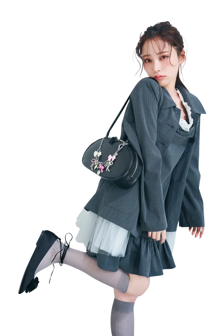 黒レザーバッグ(16×31×8cm)35,200円/ROH SEOUL チャーム 9,900円/Lovely Charm22(ビームス)ジャケット 28,600円、ミニワンピース 22,000円/ともにHONEY MI HONEY ソックス1,210円/靴下屋(Tabio)バレエシューズ 11,900円/NADIA FLORES EN ELCORAZON