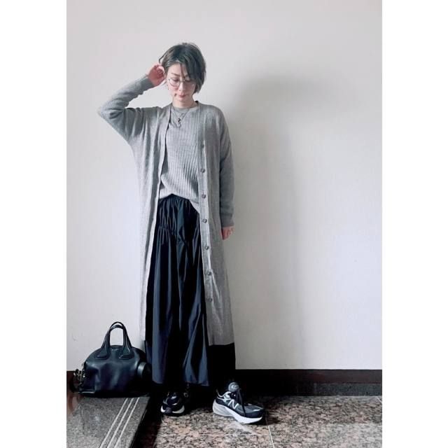 まずご紹介するのは、グレーのロングカーディガンを使ったモノトーンコーデ。インナーとカーディガンの色を統一してアンサンブル風に着こなすと、全体がすっきり見えて洗練感がアップします。大人っぽく、でも老け見えさせたくない方におすすめのコーデアイデアです。