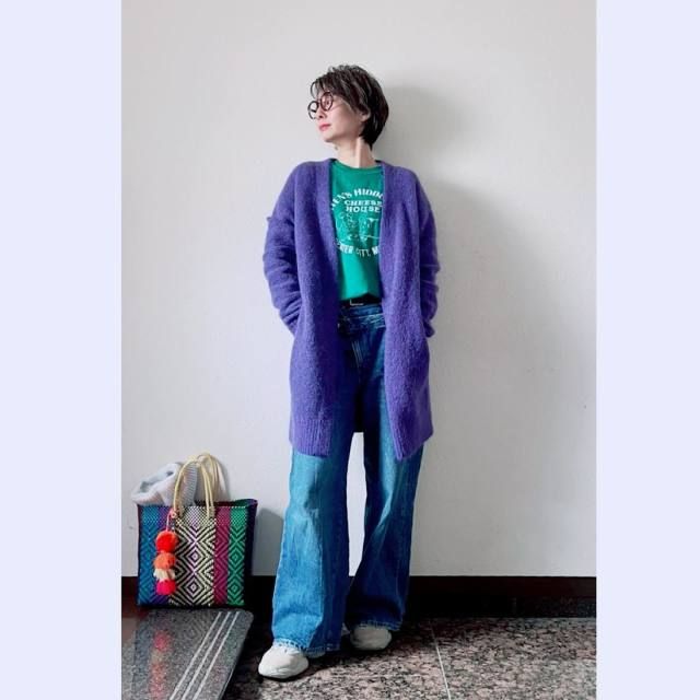 最後にご紹介するのは、パープルのロングカーディガンにグリーンのTシャツを合わせたコーデ。カラフルな配色は定番のロングカーディガンコーデを華やかにしてくれるエッセンス。華やかなカラーリングで、老け見えを回避しながらおしゃれ度もアップできます。
