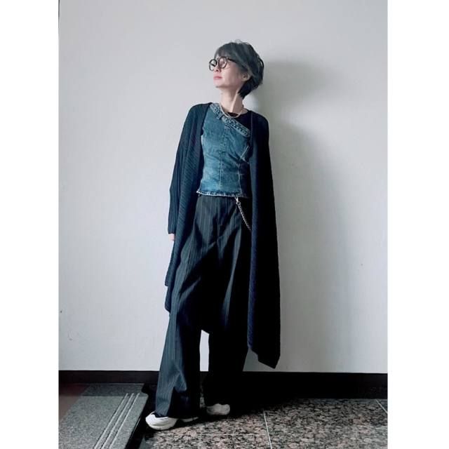 同じくメリハリアップを目指すなら、コンパクトなトップスとロングカーディガンを組み合わせるのもおすすめです。例えばスナップのようなビスチェ風トップスなら、ウエストまわりをキュッと引き締めて上半身がすっきり見え。ロングカーディガンのゆるっと感とコンパクトなトップスのメリハリが、おしゃれなバランスを作ってくれますよ。