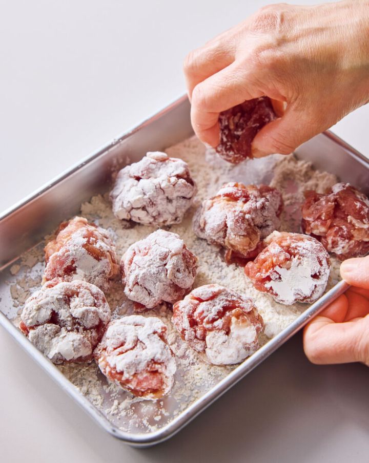 豚こま、この手があった!丸めるだけの『油淋鶏風』がホロリと柔らか、火通りも早い。