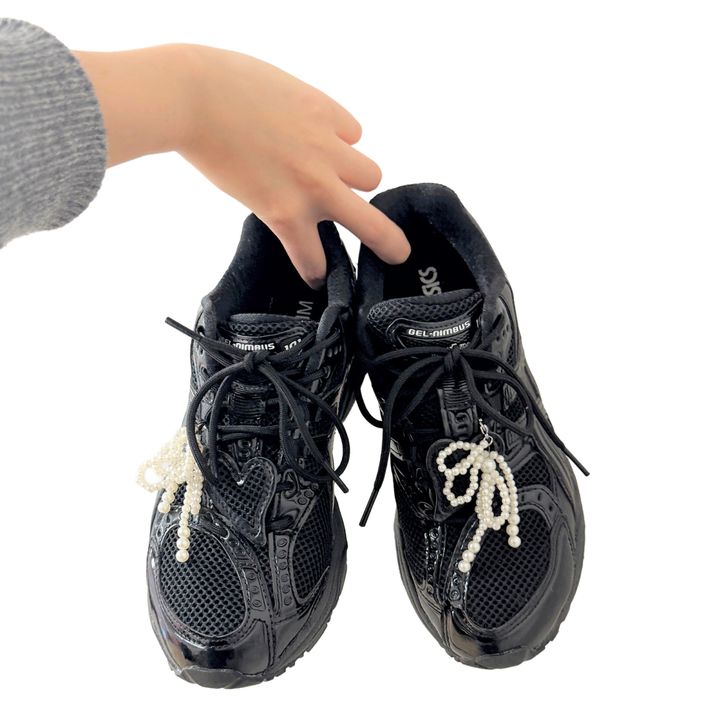 asics × KIMHĒKIMのブラックスニーカーに、パールのリボンチャームが映えて存在感たっぷり